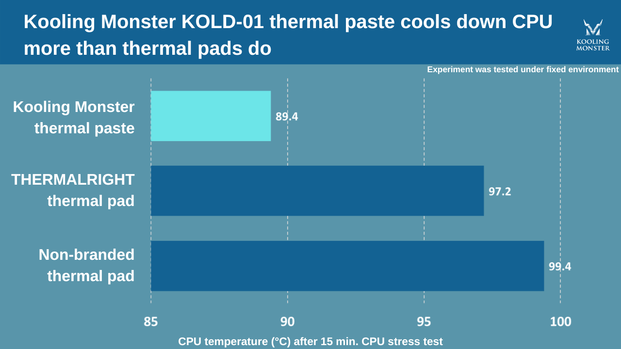 La pâte thermique surpasse considérablement les pads thermiques pour maintenir l'efficacité thermique du CPU. Lors d'un stress test, la pâte thermique Kooling Monster KOLD-01 a maintenu une température du CPU plus basse d'environ 8 degrés Celsius par rapport à un pad thermique de marque, assurant de meilleures performances du CPU.