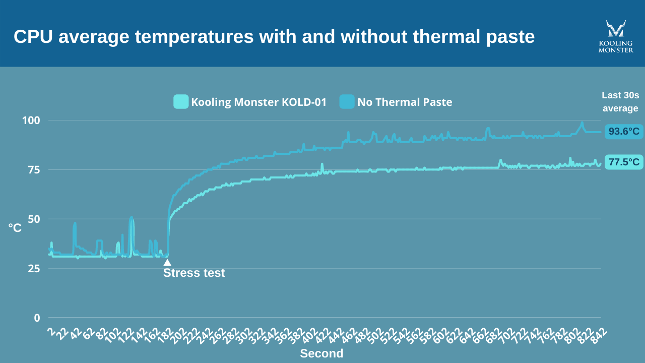 Pour démontrer l'importance de la pâte thermique, nous avons testé un ordinateur de bureau avec et sans pâte. La configuration de test comprenait un CPU Intel Core i3-10105F, une carte mère Asus H510M-E, un refroidisseur par air Golden Field et une mémoire ADATA 8 Go. Nous avons utilisé AIDA 64 pour solliciter le CPU et HWinfo pour surveiller la température du package CPU. Les résultats ont montré un écart de température significatif de 16 °C : le CPU atteignait 93,6 °C sans pâte thermique et 77,5 °C avec pâte appliquée via Kooling Monster KOLD-01 et un motif à 5 points. Cet écart thermique peut affecter considérablement les performances et la stabilité de votre PC, soulignant la nécessité de la pâte thermique dans tout système de refroidissement par air.