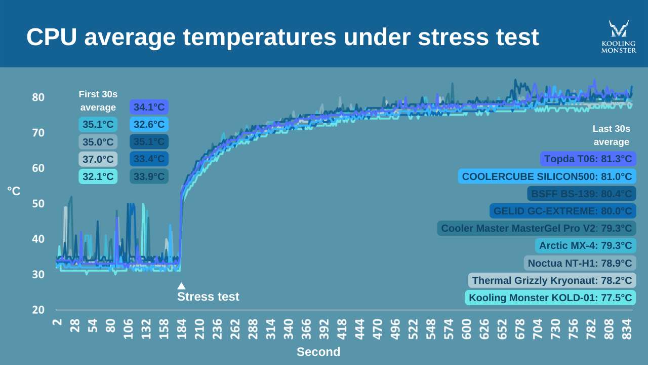 Comme le montrent les données, Kooling Monster KOLD-01 devance la pâte suivante de près d'un degré entier et la moins performante de plus de 4 degrés.