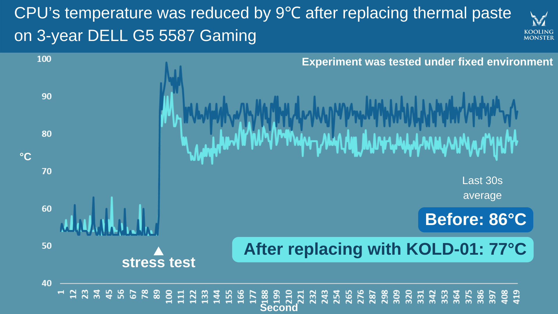 Pour rendre les choses plus claires, nous avons effectué des tests de charge sur un Dell G5 5587 Gaming âgé de 3 ans, avant et après l'application de la nouvelle pâte thermique. Pour ce test, nous avons utilisé notre propre pâte thermique Kooling Monster KOLD-01.